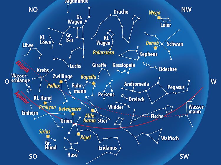 Fast im Zenit hält sich die gelbe Kapella im Fuhrmann auf. Der Fuhrmann gilt als Erbauer des Himmelswagens, der weit im Nordosten zu sehen ist. Am Osthimmel haben sich die Zwillinge mit den beiden hellen Sternen Kastor und Pollux emporgeschwungen. Im Südosten steht etwas einsam Prokyon im Kleinen Hund. Prokyon heißt so viel wie Vorhund. Denn er geht vor Sirius im Großen Hund auf. Mit elf Lichtjahren Entfernung gehört Prokyon ebenfalls zu den Nachbarsternen unserer Sonne.