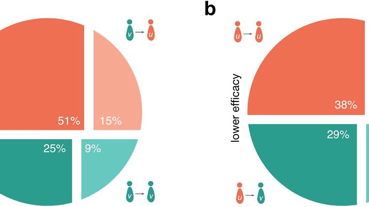 Das Ergebnis ihrer Modellierung: Bis zu drei Viertel aller Neuinfektionen werden von Ungeimpften verursacht. Jede zweite Übertragung findet zudem zwischen Ungeimpften statt - aber nur jede zehnte zwischen Geimpften. Und nur etwa jede siebte Infektion erfolgt von einem Geimpften auf einen Ungeimpften. Selbst bei einer geringeren Schutzwirkung des Impfstoffs, was die Forscher ebenfalls in Betracht zogen, ergibt sich ein ähnlich eindeutiges Bild. Schützt das Vakzin nur zu 50 bis 60 Prozent, gehen immer noch zwei Drittel aller Neuinfektionen auf Ungeimpfte zurück. Nur etwa jede sechste Übertragung findet dann zwischen Geimpften statt.