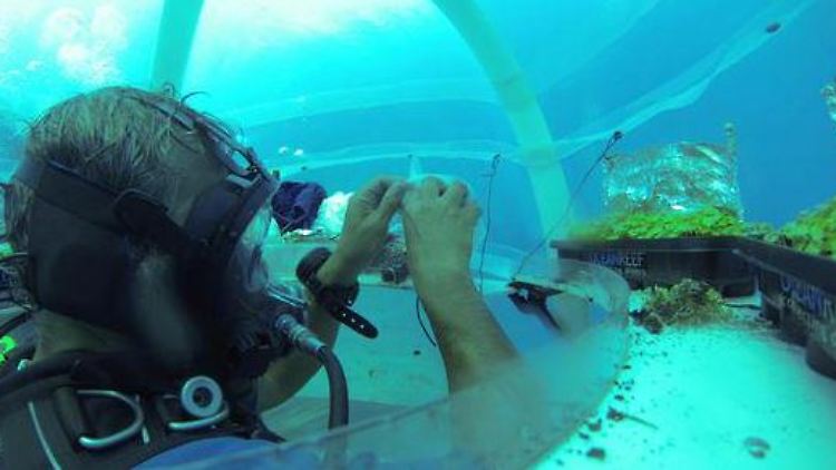 Die Verdunstung sorgt für 80 bis 90 Prozent Feuchtigkeit in den Glocken, genügend Süßwasser also für die Pflanzen. Und in der sonnigen Region dringen 60 Prozent des Oberflächenlichts bis in diese Tiefe durch - damit können die Pflanzen durch Photosynthese Sauerstoff bilden. Unter jeder Glocke ist eine Plattform angebracht, auf der die Taucher arbeiten können. Denn trotz Sensoren und Kameras unternehmen sie tägliche Tauchgänge zu den Plantagen.