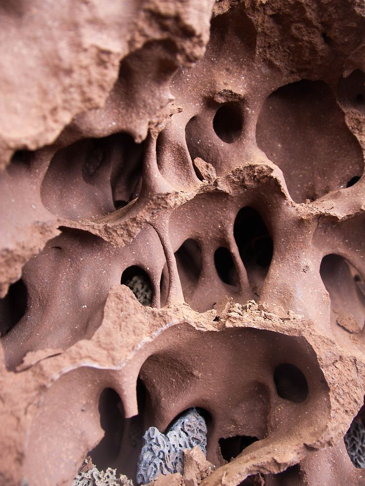 Teil des Austrittskomplexes eines Hügels von Macrotermes michaelseni-Termiten aus Namibia.