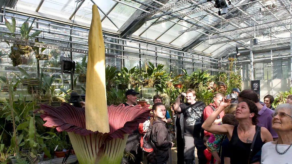 Die tropische Pflanze, mit wissenschaftlichem Namen "Amorphophallus titanum", wächst in der Natur im Regenwald auf der indonesischen Insel Sumatra und wird zwischen eineinhalb und drei Metern hoch. Sie blüht nur sehr selten. Dann strömt sie einen starken Aasgeruch aus, um Insekten für die Bestäubung anzulocken. Aus dem gleichen Grund erwärmt sich der Blütenstand dann um rund neun Grad. Die Blüte endet jedoch nach wenigen Tagen. Dann fällt der Kolben in sich zusammen und das Hüllblatt schließt sich.