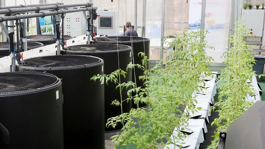Im Forschungsgewächshaus sprudelt Wasser in fast mannshohe Fischbassins und in der Mitte ranken lange Reihen Tomaten aus Bottichen empor. Die Behälter sind durch Rohre und Schläuche verbunden, im Hintergrund brummen Bio-Kläranlagen und Bakterien-Filter. Es ist so heiß, dass sich Wasser am Glasdach absetzt - auch das ist Teil des Kreislaufkonzepts.