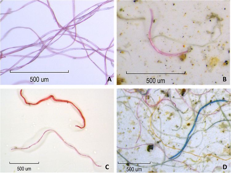 A) Polyesterfasern, die von der in der Studie verwendeten Vliesdecke gesammelt wurden, B) Fasern von der Vliesdecke, die in der Schneeprobe gefunden wurden, C) Vergleich zwischen Fasern von der Vliesdecke und dunkleren Fasern, die als "andere" identifiziert wurden, und D) Fasern, die in der Schneeprobe gefunden wurden.