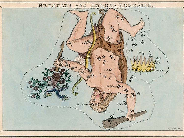 Herkules und das Sternbild Corona Borealis auf einer Abbildung aus dem 19. Jahrhundert.