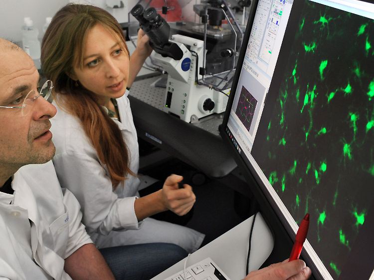 Bechmann und die Doktorandin Sonja Kallendrusch betrachten auf einem Bildschirm Entzündungszellen im Gehirn von Mäusen, die einen Verlauf von Kulturen in Abständen über mehrere Wochen dokumentieren.