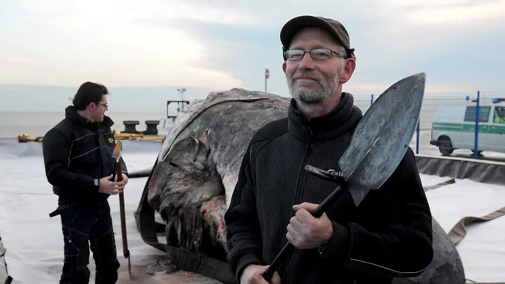 Der Niederländer hat am Wochenende im JadeWeserPort in Wilhelmshaven mit einer Gruppe von Helfern die Kadaver der zwei Pottwale zerlegt, die vor einer Woche auf Wangerooge gestrandet waren. Trotz Schneeschaudern und eisigem Wind kamen die Arbeiten gut voran. Der kleinere der beiden Jungbullen war am Sonntagabend fertig skelettiert. Zunächst habe man die Haut in Streifen geschnitten und dann mithilfe eines Baggers vom Körper abgezogen. Zusammen mit der Haut löste sich auch die etwa 12 Zentimeter dicke Fettschicht, der sogenannte Blubber. Danach wurden die Muskeln und Sehnen abgelöst. Auch die Eingeweide entnahmen die Helfer - dabei besahen sie sich den Mageninhalt.