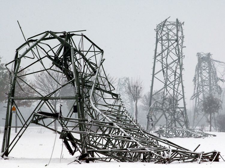 2005 im Münsterland: Unter der Last von Nassschnee war ein Mast gebrochen. Das führte zum Zusammenbruch vieler anderer Strommasten.