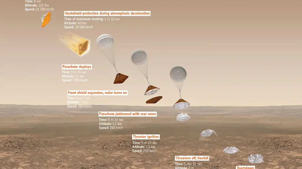 Die starke Reibung der Gasteilchen am Hitzeschild des Test-Landers senkt die Geschwindigkeit drastisch: Wenn Schiaparelli sich der Mars-Oberfläche bis auf 11 Kilometer genähert hat, ist er nur noch 1700 km/h schnell – was für den Aufprall natürlich bei Weitem zu viel ist. Deswegen kommt an dieser Stelle ein Fallschirm zum Einsatz. An ihm sinkt das Landegerät hinab, bis es nur noch 1 Kilometer zurückzulegen hat. Dann ist die Zeit für die Bremstriebwerke gekommen. Wenn die sich ausschalten, ist Schiaparelli nur noch zwei Meter vom Marsboden entfernt. Das letzte Stück plumpst er im freien Fall - mit 10 km/h.