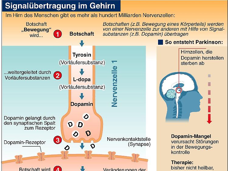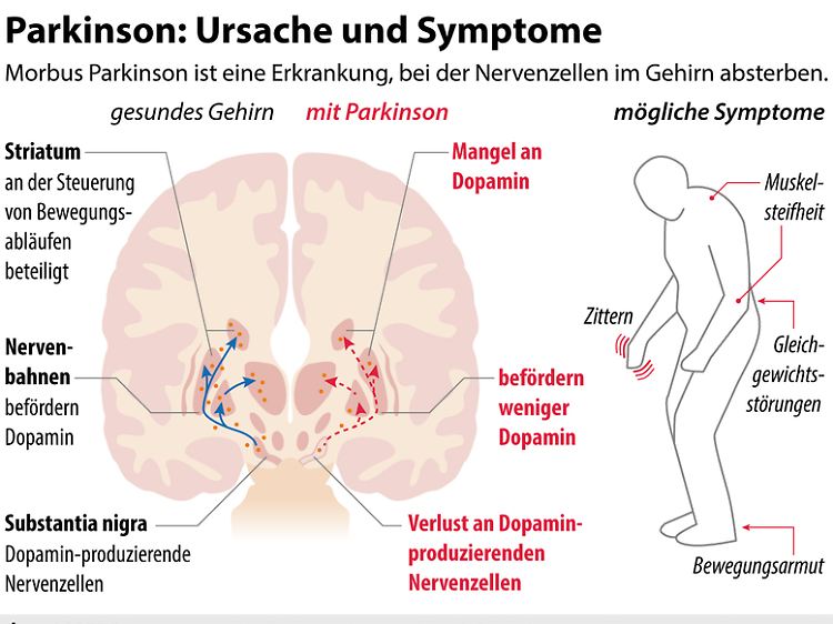 Bei Parkinson sterben im Gehirn jene Nervenzellen ab, die Dopamin produzieren - ein für die Bewegungssteuerung wichtiger Botenstoff. Dabei ist das Protein Alpha-Synuclein zentral: Fehlgefaltete Formen dieses Proteins verklumpen und lagern sich im Hirn ab. "Die genauen Ursachen sind aber noch nicht bekannt", sagt die Neurologin Brit Mollenhauer, Chefärztin an der Paracelsus-Elena Klinik in Kassel. Wahrscheinlich handele es sich um ein Zusammenspiel aus Umwelt-, metabolischen und genetischen Faktoren.