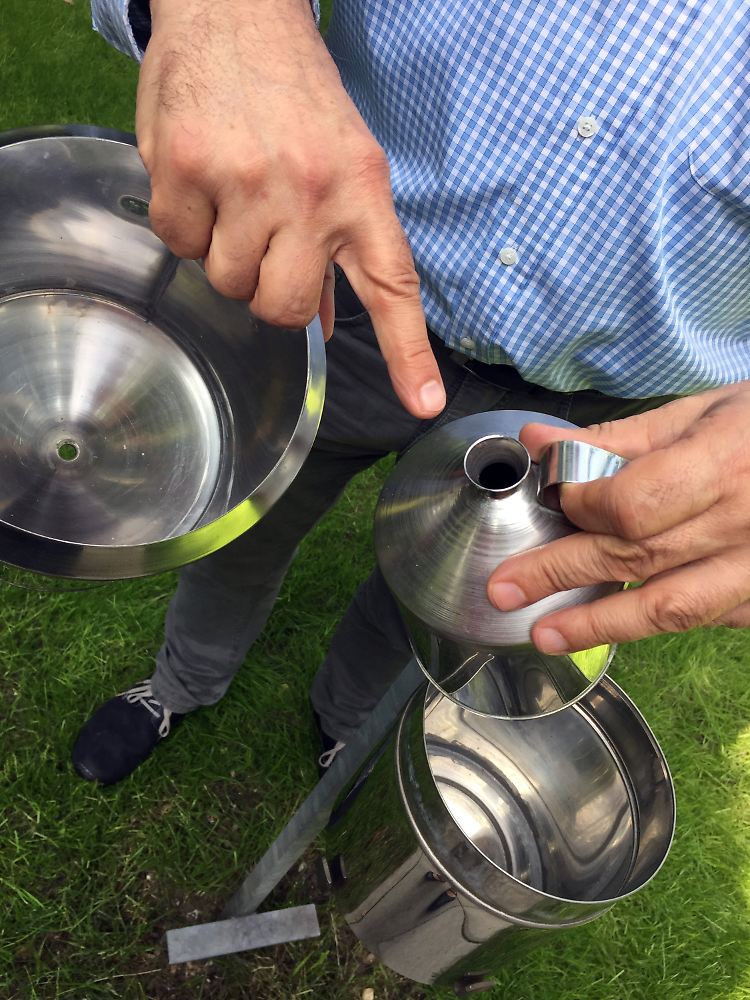 Ein DWD-Mitarbeiter demonstriert ein Niederschlagsmessgerät. Um Regenmengen zu messen, muss das Wasser durch den kleinen Trichter in das Gerät gelangen.