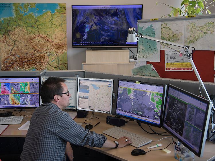 Das aktuelle Wetter in Deutschland behalten Mitarbeiter des DWD in Offenbach mithilfe von Monitoren im Blick. Sie können zur Gewinnung der Daten auf ein Netz aus abertausenden Messstationen rund um den Erdball zurückgreifen.