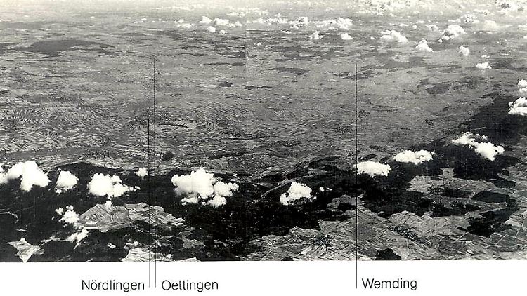 Das "Nördlinger Ries" ist der besterforschte Meteoritenkrater. Sein Durchmesser: 25 Kilometer. Der Wolkenkranz markiert den bewaldeten Kraterrand.