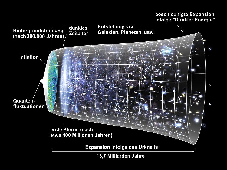 Der Urknall ist eine Theorie. Sie besagt, dass das Universum aus einer Singularität entstanden ist, aus einem minimalsten Punkt, einem Punkt mit unglaublich hoher Dichte. Er enthielt die gesamte Materie und Energie des Universums. Bei extrem hoher Temperatur begann vor rund 13,7 Milliarden Jahren aus diesem Punkt heraus eine Expansion. Die Entwicklung des Universums hatte ihren Lauf genommen – und sie hält an.
