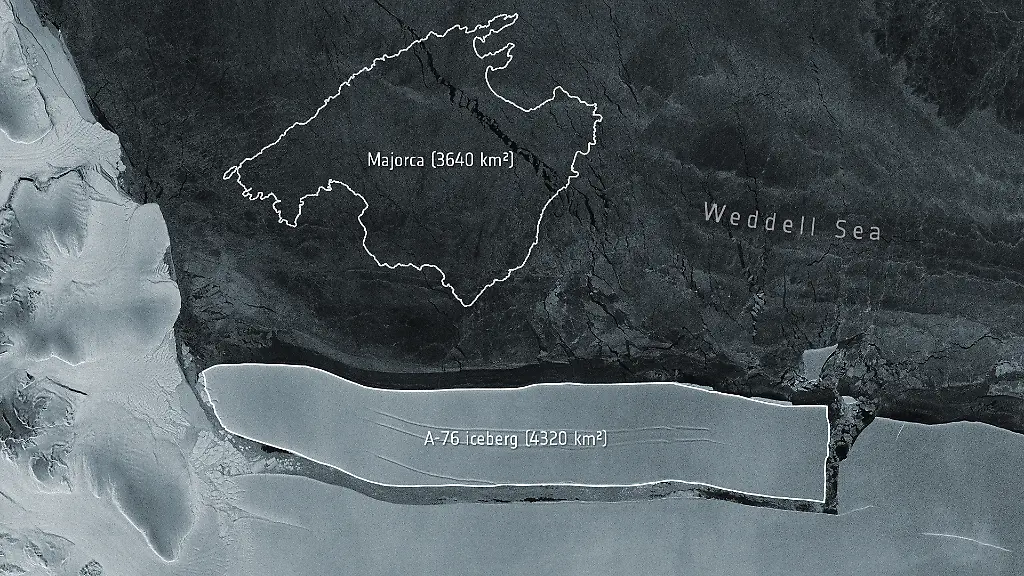 Mit einer Länge von rund 170 Kilometern und einer Breite von 25 Kilometern sei A-76 etwas größer als Mallorca, teilte die ESA weiter mit. Bisher hatte der Eisberg A-32A als aktuell größter gegolten, er kommt auf eine Fläche von etwa 3880 Quadratkilometern und treibt ebenfalls im Weddellmeer. Zum Vergleich: Der A-74, der im Februar aus dem Brunt-Schelfeis abgebrochen war, hatte eine Fläche von lediglich 1270 Quadratkilometern.