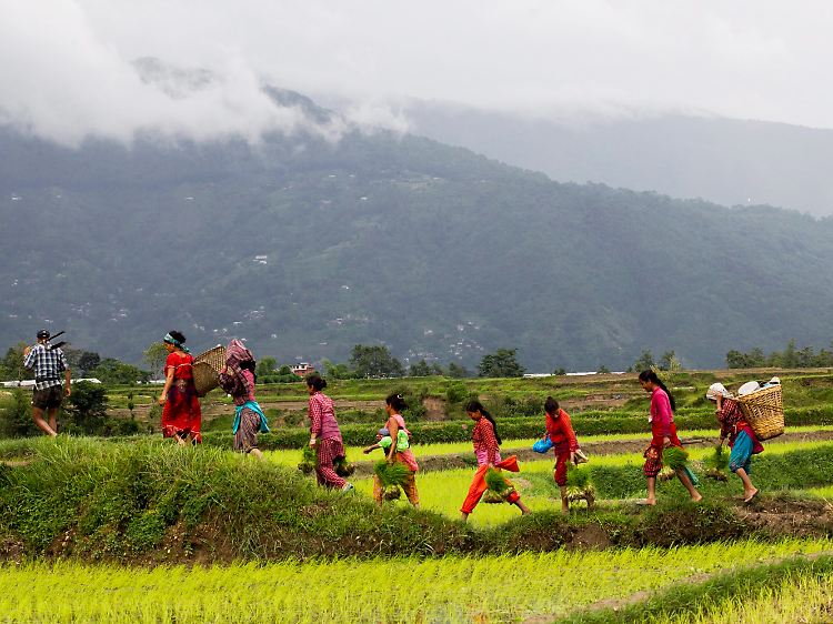 Nach getaner Arbeit: Nepalesische Bauern tragen ihre Gerätschaften vom Reisfeld nach Hause.