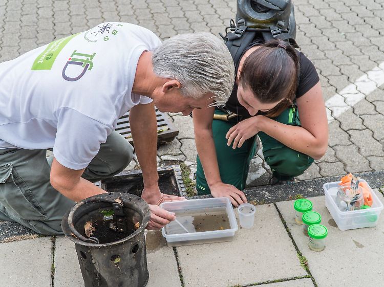 Mitarbeiter der kommunalen Aktionsgemeinschaft zur Bekämpfung der Schnakenplage (Kabs) überprüfen in Karlsruhe eine mögliche Brutstätte der Tigermücke.