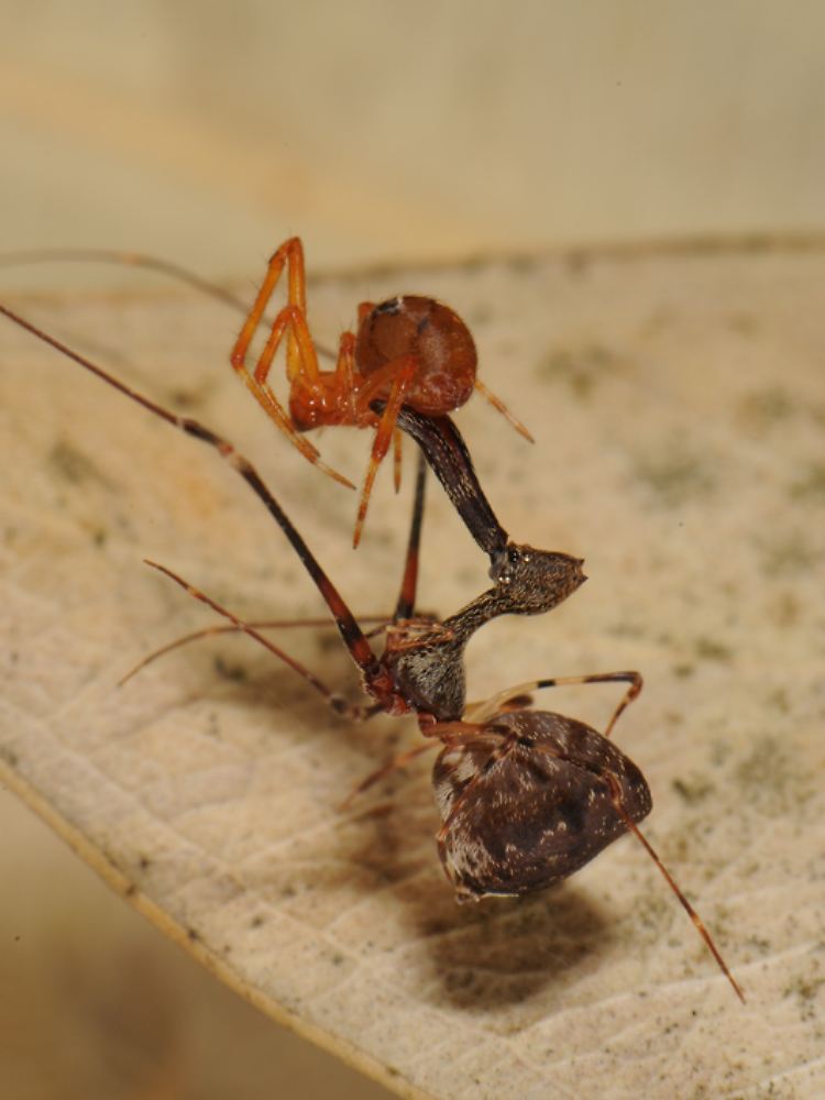 Pelikanspinnen haben ein bizarres Aussehen mit einem langen "Hals" und Cheliceren (Kiefer), die benutzt werden, um andere Spinnen zu erbeuten. Diese Pelikanspinne (oben) hält ihre Beutespinne mit ihren Cheliceren.