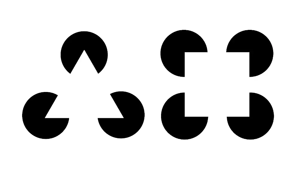 Eine Illusion entsteht, wenn Menschen etwas sehen, das nicht dem entspricht, was die Augen ans Gehirn übermitteln. Im Fall des oben stehenden Bildes sind die optischen Sinneseindrücke sieben Pac-Man-ähnliche schwarze Figuren. Was man jedoch zu sehen glaubt, ist ein weißes Dreieck auf der linken und ein weißes Quadrat auf der rechten Seite. Es handelt sich um eine optische Täuschung, auch bekannt als Kanizsa-Dreieck und- Quadrat.