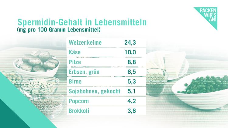Spermidin ist eine Substanz, die ursprünglich in Samenflüssigkeit gefunden wurde, sie kommt aber in allen menschlichen Körperzellen vor, sowohl bei Männern als auch bei Frauen. Spermidin dient als eine Art Müllabfuhr in den Zellen, entsorgt Zellschrott und reinigt so die Zellen. Mit dem Alter aber nimmt die Konzentration von Spermidin ab, das Recycling der Zellen lässt nach und das fördert Alterungsprozesse.