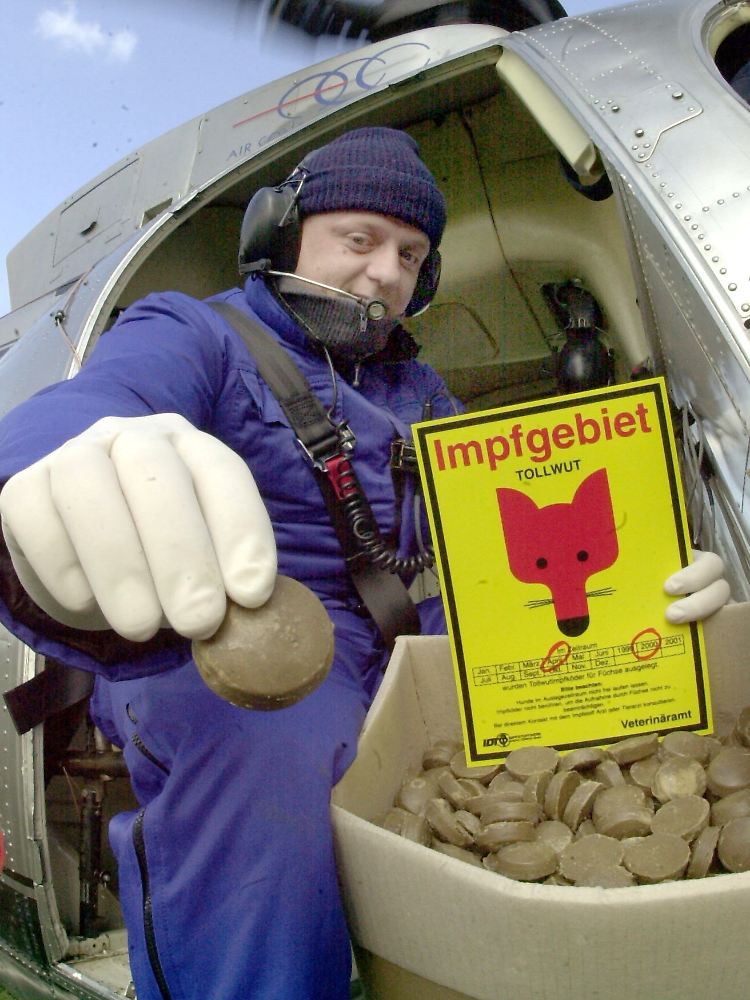 Köder zur Tollwutimpfung wurden meist per Hubschrauber über die betroffenen Gebiete abgeworfen.