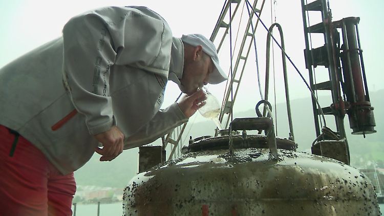 Zurück am Ufer schraubt der Bregenzer Möth den Deckel des Fasses auf. Mit einem Weinheber - einer Art Saugrohr - entnimmt er eine Kostprobe und trinkt. Ein Lächeln breitet sich auf seinem Gesicht aus. "Da kommt was auf uns zu!", verkündet er dem lauschenden Publikum. "Cremig, exotisch, saftig, voller Wucht am Gaumen. Trotzdem mit ein bisschen Salzigkeit ausgestattet."