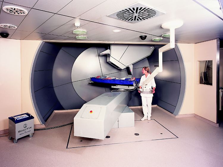 Die Patienten liegen während der rund 60 Sekunden dauernden Bestrahlung auf einer Pritsche, die speziell für sie angefertigt wurde. Diese Spezialliegen sollen sicherstellen, dass die Patienten bei jeder Bestrahlung dieselbe Position haben, der Tumor also immer exakt getroffen wird.
