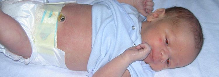 Der Bauchnabel eines elf Tage alten Kindes. Deutlich ist hier der vertrocknete Rest der Nabelschnur zu erkennen.