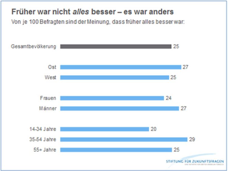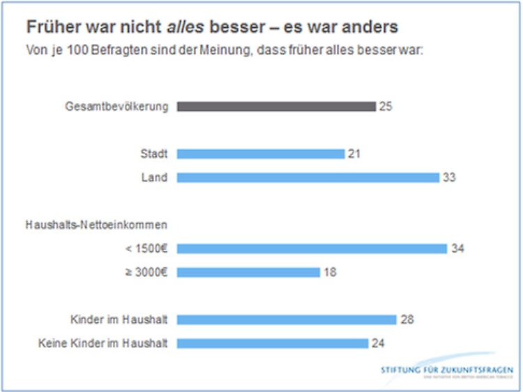 Wie man auf die Vergangenheit blickt, hat tatsächlich etwas mit dem Alter zu tun. Die Überzeugung, dass sich die Lebensbedingungen in den letzten Jahrzehnten verschlechtert haben, ist nämlich nicht in allen Jahrgangsstufen gleich stark ausgeprägt. Es sind die 35- bis 55-Jährigen, die diese Ansicht besonders häufig vertreten. Wie aus einer Umfrage der BAT Stiftung für Zukunftsfragen hervorgeht, findet fast ein Drittel der Deutschen dieser Altersgruppe, dass man früher besser gelebt habe. Auch ist man auf dem Land eher dieser Meinung als in der Stadt. 33 Prozent der Landbevölkerung, aber nur 21 Prozent der Städter glauben: Früher war alles besser. In der Gesamtbevölkerung stimmt diesem Credo immerhin noch jeder Vierte zu.