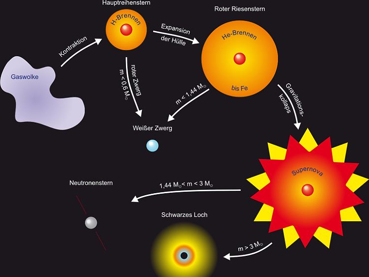 Unsere Sonne: Sie wird erst Roter Riese und dann Weißer Zwerg, bevor sie als Schwarzer Zwerg gänzlich erlischt.