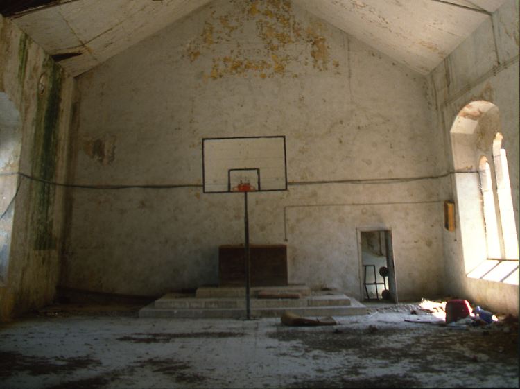 Die zerfallene Kirche mit dem in der Holzkiste versteckten Altar im Jahr 2000.