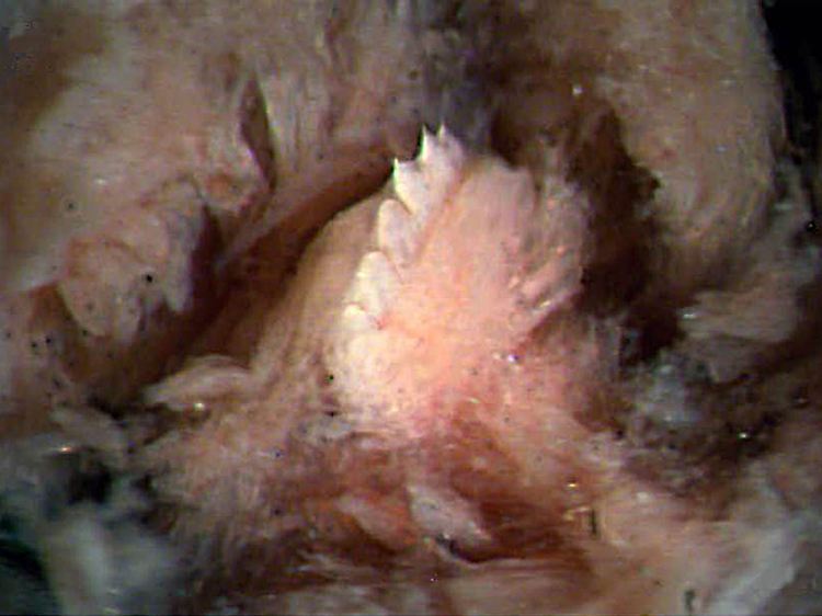 Die Mikroskopaufnahme zeigt den Kiefer mit sehr großen Zähnen eines Blutegels Tyrannobdella rex.