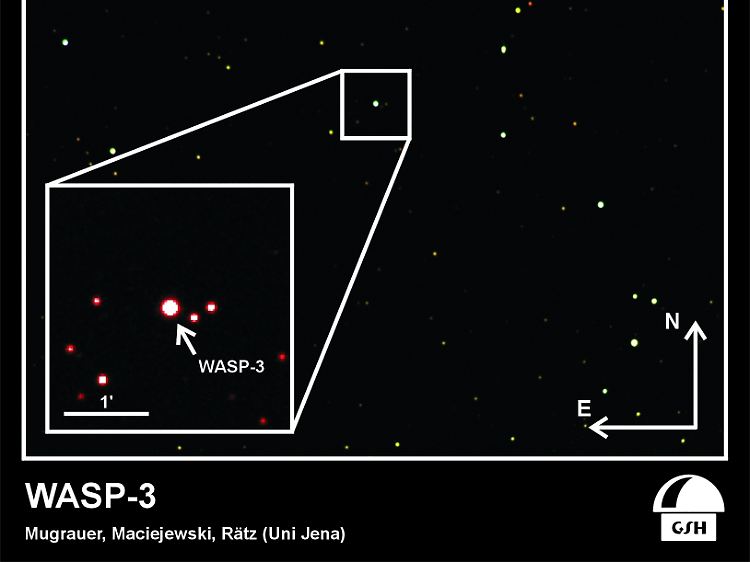 Auf der Jagd nach fernen Planeten sind Astronomen aus Deutschland, Polen und Bulgarien erstmals mit einer neuen Methode fündig geworden. Der neu entdeckte Himmelskörper heißt WASP-3c und ist rund 700 Lichtjahre von der Erde entfernt. Er umkreise im Sternbild Leier den Stern WASP-3 und braucht für eine Runde 3,75 Tage, teilte die Universität Jena mit. Bisher waren mehr als 460 Planeten außerhalb unseres Sonnensystems bekannt.