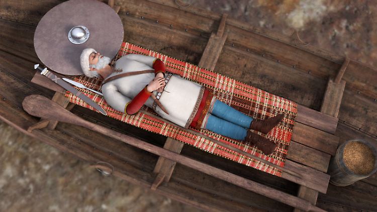 Modellhafte Darstellung der Beerdigung einer Frau in einem Bootsgrab in der Wikingerzeit in Norwegen.