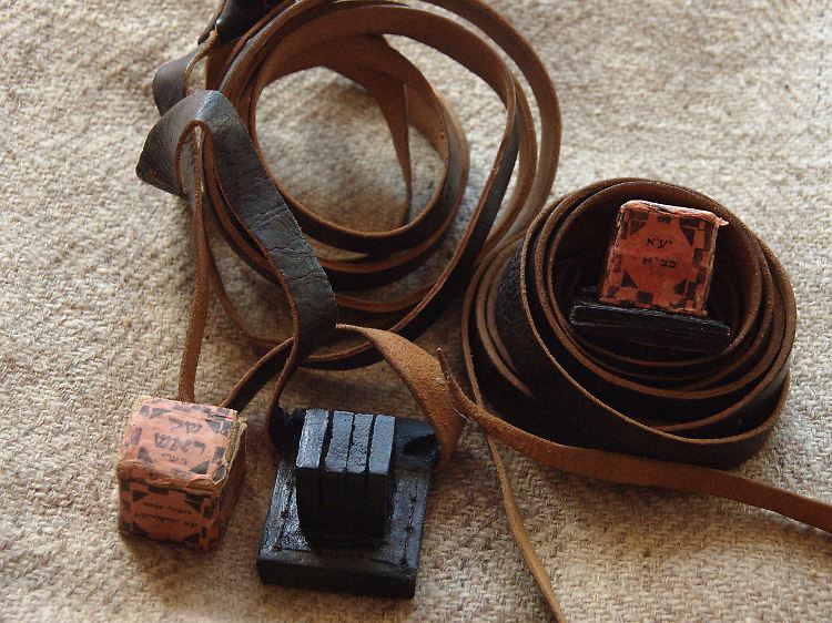 Tefillin, Gebetsriemen, legt jeder fromme Jude täglich zum Morgengebet an. Jene kuriosen Lederkästen mit langen Lederriemen werden auf die Stirn gesetzt und mit den Riemen an den Oberarm gebunden. In den Kästen befinden sich winzige Pergamente mit Versen aus der Tora, Exodus und Deutoronomium. Darin steht, dass man "diese Worte" am Kopf und am Herzen tragen soll und am Torpfosten anbringen. Dieses Gottesgebot haben die Juden schon vor Tausenden Jahren wörtlich genommen. Deshalb beten sie mit Tefillin und deshalb sind jüdische Wohnungen an kleinen schräg hängenden Kästen aus Holz oder Metall an den Türpfosten zu erkennen, die ebenfalls ein Pergament mit den Bibelversen enthalten. Warum schräg? Weil man sich nicht einigen konnte, ob sie senkrecht oder waagerecht angebracht werden sollten.