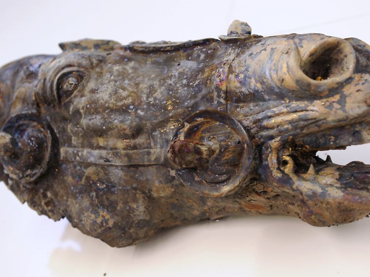 Die Forscher fanden in einem Brunnen den lebensgroßen Pferdekopf einer vergoldeten bronzenen Reiterstatue und einen Schuh des Reiters. "Einen Fund solcher Qualität und Erhaltung hat es in Deutschland bisher nicht gegeben", hieß es aus dem Ministerium. Zwar sei vor längerer Zeit auch in Augsburg ein Pferdekopf gefunden worden. Der sei aber nicht so aufwendig gearbeitet wie der Fund von Waldgirmes. In Waldgirmes werden seit Jahren Fragmente der Statue ausgegraben.