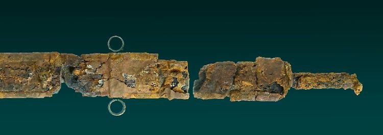 Ganz ungewöhnlich ist der Erhaltungszustand des 60 Zentimeter langen Schwerts, das noch in seiner dekorierten ledernen Scheide steckte. Ein Teil des Gürtels, an dem das Schwert mit Ösen hing, wurde ebenfalls in dem Abwasserkanal gefunden. "Das ist ein seltener Fund, weil Leder normalerweise schnell vergeht und nicht erhalten bleibt", sagt Reich.